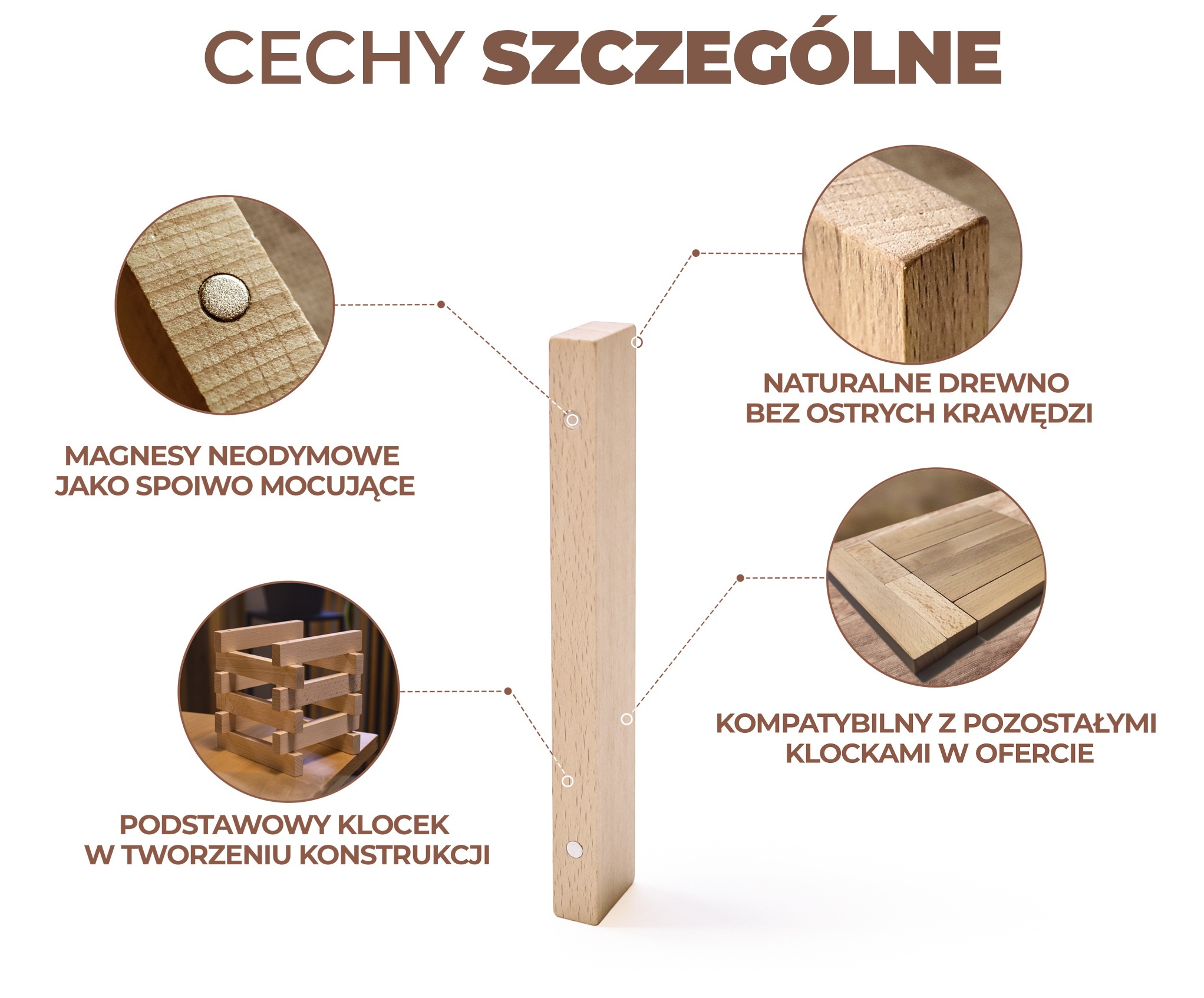 Poznaj drewniany klocek bukowy o wymiarach 22 mm × 11 mm × 130 mm— klocek, który jest podstawowym budulcem konstrukcyjnym w naszych zestawach. Wykonany z naturalnego drewna bukowego, jest trwały, gładko oszlifowany i w pełni bezpieczny zarówno dla dzieci, jak i dorosłych konstruktorów. Posiada 4 magnesy neodymowe umieszczone w osi Y, które znacznie rozszerzają możliwości konstrukcyjne - ograniczeniem jest tylko nasza wyobraźnia, czas i ilość posiadanych klocków ;)